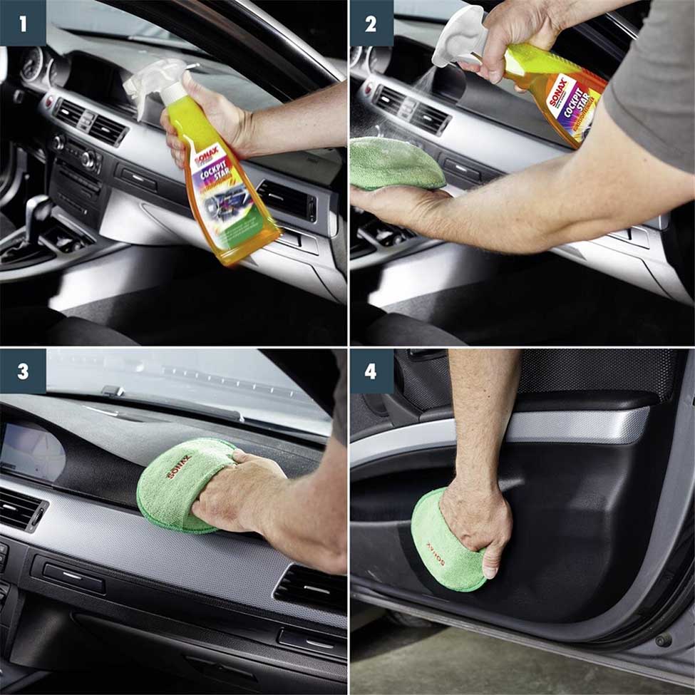 Die Anwendung von SONAX CockpitStar ist denkbar einfach. Man sprüht den Reiniger auf die zu reinigende Oberfläche und wischt sie dann mit einem sauberen, weichen Tuch ab. Während der Reinigung wird kein intensiver chemischer Geruch wahrgenommen, und nach der Anwendung bleibt der Innenraum geruchsfrei und verströmt stattdessen einen dezenten, frischen Duft.